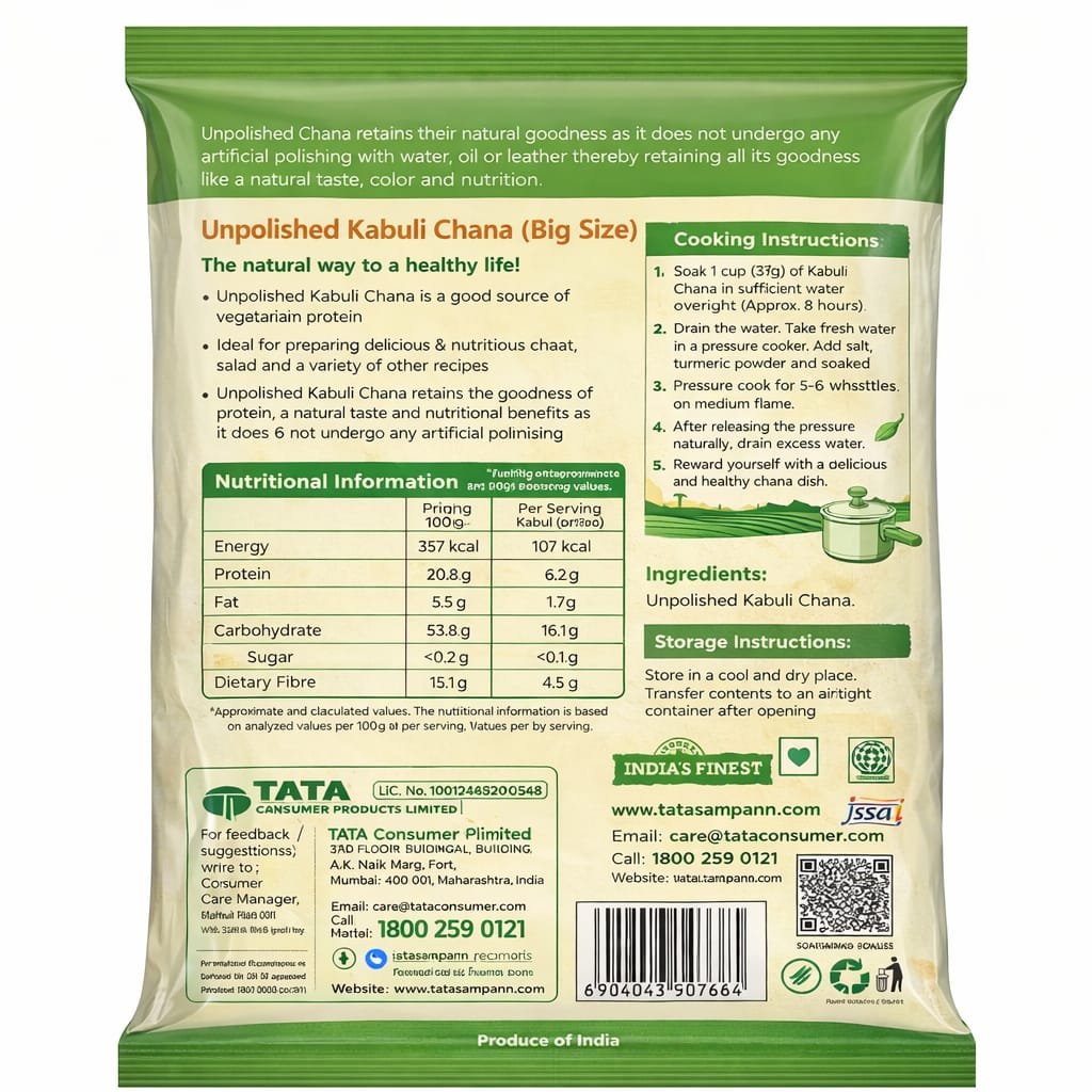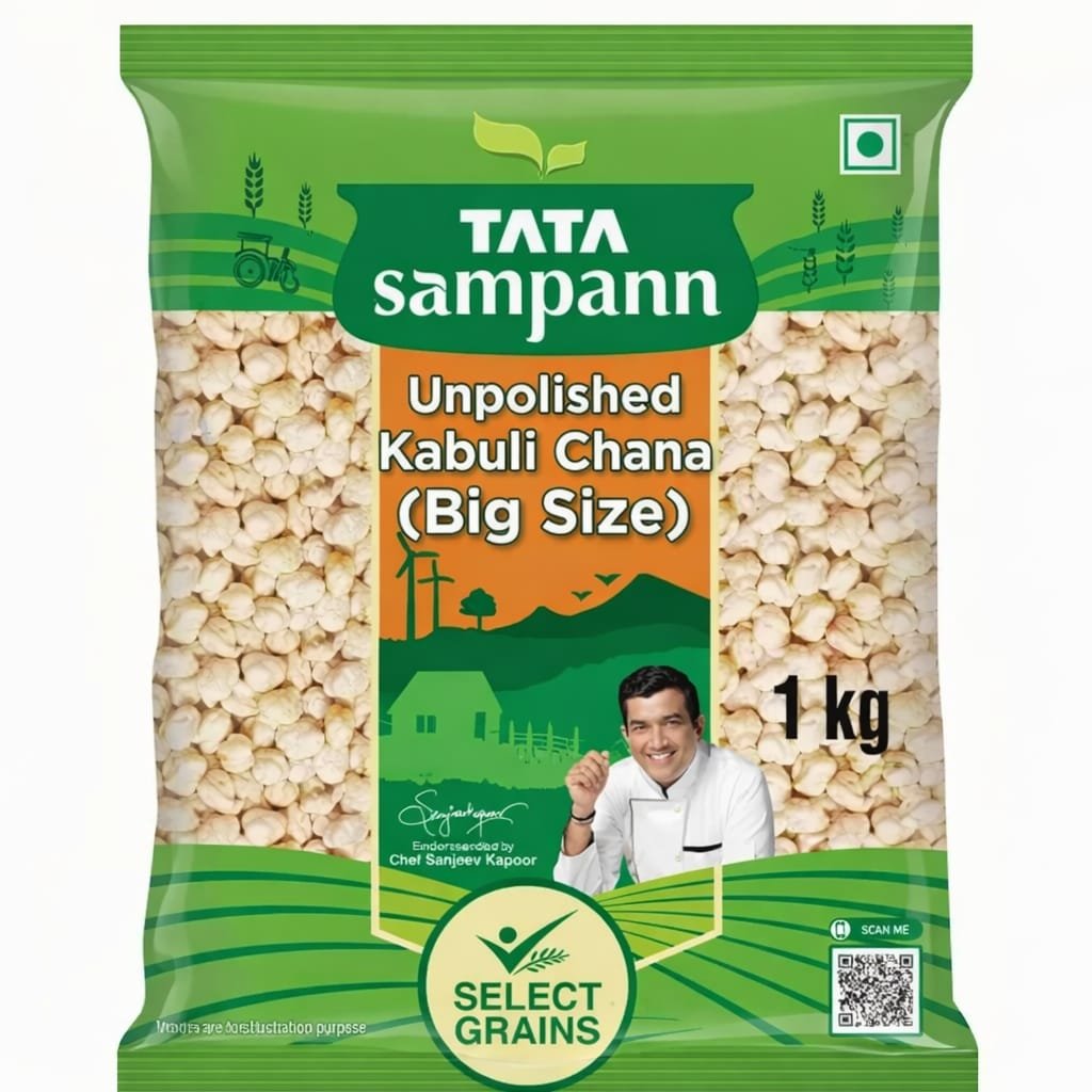 Tata Sampann Unpolished Kabuli Chana (Big Size) is made from carefully selected premium-quality chickpeas that retain their natural goodness as they are not artificially polished. Being unpolished helps preserve essential nutrients, natural taste, and authentic texture. Rich in protein and dietary fiber, it supports a healthy lifestyle and is ideal for preparing chole, salads, chaat, and various traditional Indian dishes. The big-sized grains cook well and offer a soft, delicious bite. Hygienically packed to ensure purity and freshness in every pack.